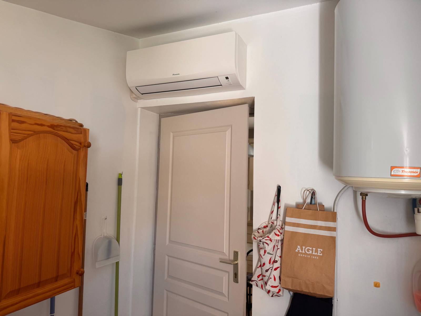 L’installation de la climatisation réversible Daikin tri-split à Roaix repose sur un groupe extérieur alimentant deux unités murales et une console. Cette combinaison permet d’optimiser la diffusion de l’air selon la configuration de chaque pièce. Le système repose sur la technologie inverter, assurant une modulation fine de la puissance et une consommation réduite. Les unités intérieures sont discrètes, silencieuses et faciles à piloter. La console, installée en rez-de-chaussée, complète efficacement les unités murales situées dans les chambres à l’étage.